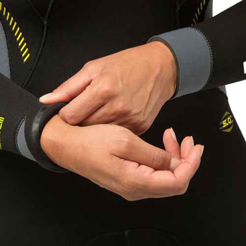 Tauchanzug Damen • 5 mm Neopren doppelte dicke • Vorgeformte Beine • Ärmel aus doppelseitigem Neopren • YKK-Reißverschluss auf der Rückseite mit Dichtleiste und Wasser-stop • Elastische Tatex-Antiverschleißverstärkungen