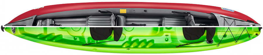 - Kajaks aus 100% PVC ähneln den bekannten aufblasbaren Strandmatratzen etc. Die Luftschläuche verfügen zudem über keinen zusätzlichen Schutz. Aus diesem Grund sollten nur kurze und ufernahe Touren unternommen werden. Diese Kajaks sind nicht sehr beständig und haben meist eine kurze Lebensdauer.