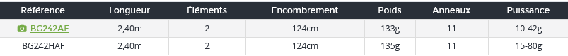 | BG242HAF | Länge in cm 240 Anzahl der Stränge 2 Größe in cm 124 Leistung in gr 15-80 Gewicht in gr 135 |