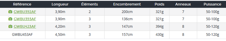 Länge 390 bis 450 cm - Leistung 50 bis 120 gr - Buchse 3 Stränge - Blank carbon HVF (High Volumen Fiber) mit Braiding-X-Verstärkung