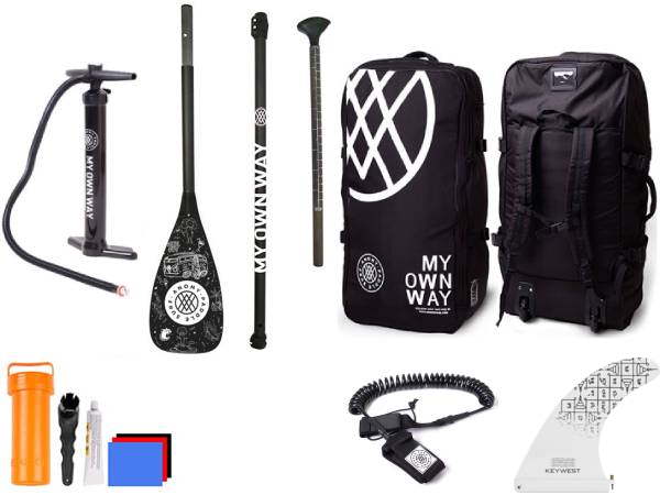 “ Das set Anomy ist ein set, das mit einer board, einem finne, einer Pumpe, einem transporttasche sowie einem 3-teiligen Carbon- paddel und einem leash geliefert wird.