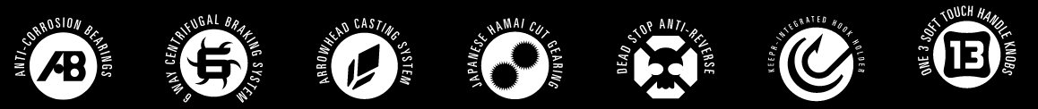 Die Arrowhead-Schnurführung und die leistungsstarken, korrosionsbeständigen Kugellager verbessern die Wurfweiten, während das Multi-Material-Bremssystem und das japanische Hamai-Bremsrad dabei helfen, die stärksten Fische zu überwinden.