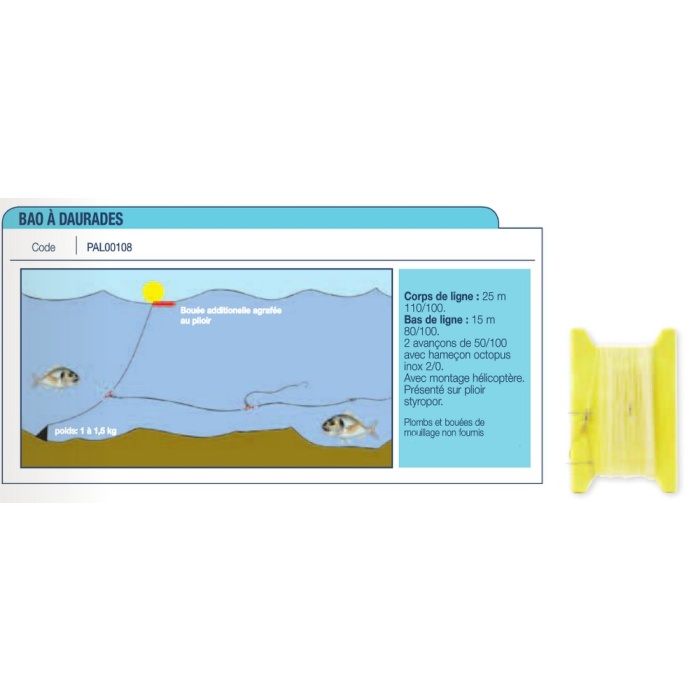Vorlauf: 15 m in 80/100. 2 Vorfächer von 50/100 mit Haken Oktopus Edelstahl 2/0. Mit Hubschrauberhalterung.