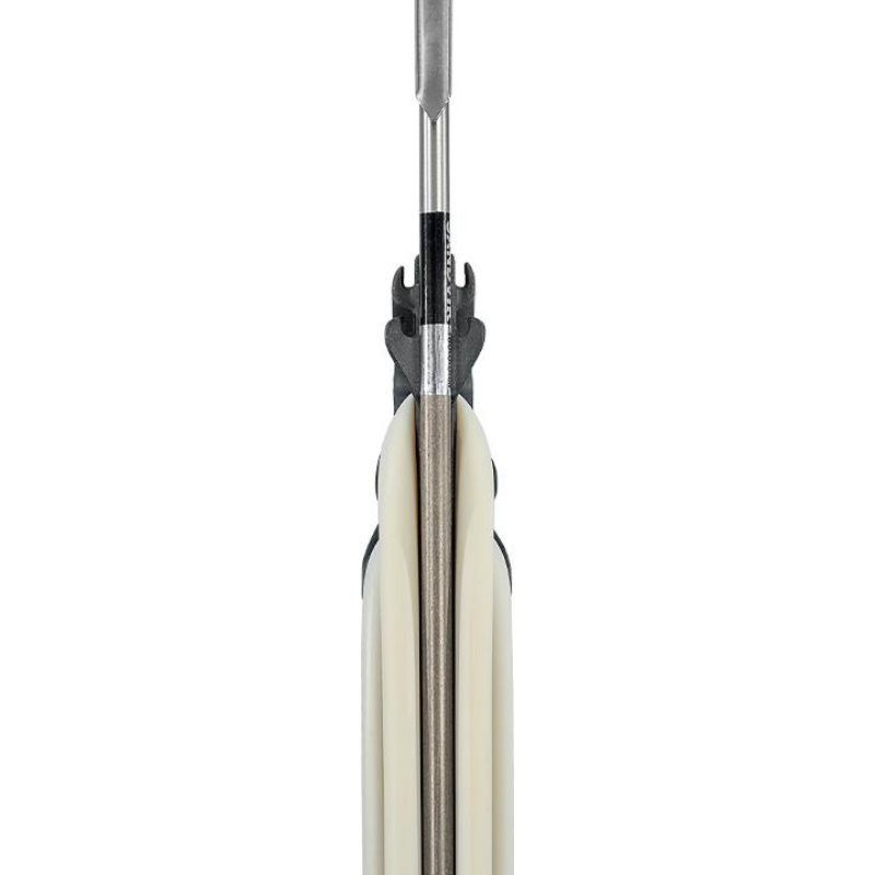 Der Harpune Laser Evo Pro ist mit einer offener kopf ausgestattet, die es den gummibänder ermöglicht, parallel zu le tube und harpune zu arbeiten, was den leistung Schuss erheblich erhöht. Zusammen mit einer pfeil aus Sandvik-Edelstahl mit einem Durchmesser von 6,75 mm, die mit einem einzigen widerhaken und einer dreiseitigen Spitze ausgestattet ist, garantiert diese Konfiguration eine optimale Präzision. Die beiden Ø14 TNT GREY gummibänder pro Meter bieten eine extreme leistung für eine hervorragende Schussleistung.
