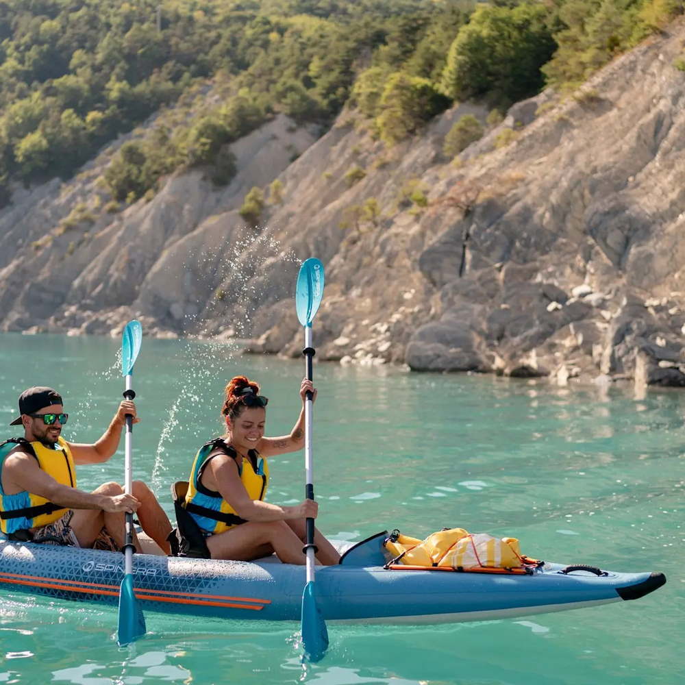 Auf dem Wasser sorgt seine leichte Struktur für eineflüssige Manövrierbarkeit und eine sofortige Handhabung, ideal für alle, die ein leistungsstarkes und äußerst praktisches Kajak suchen.