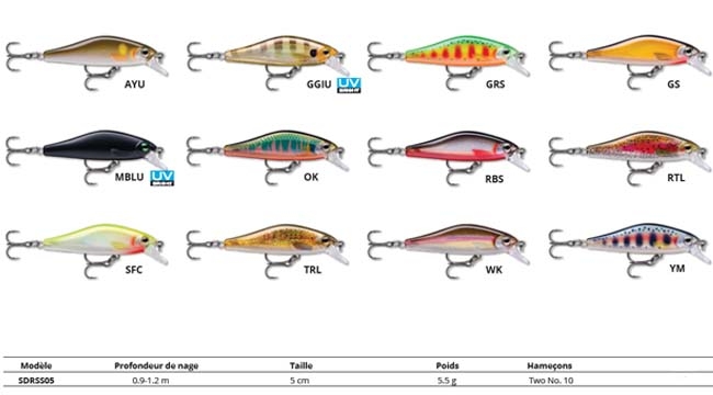AYU - Ayu; GGIU - Glassy Gill UV; GRS - Green Shad; GS - Gold Shad; MBLU - Matte Black UV; OK - Oikawa; RBS - Red Belly Shad; RTL - Lebende Regenbogenforelle; SFC - Silberne Fluoreszenz-Charteruse; TRL - Lebende Bachforelle; WK - Wakasagi; YM - Yamame