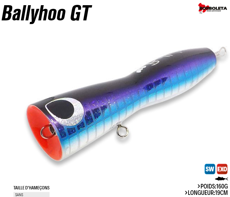 Der BALLYHOO GT ist ein hochwertiger Zedernholz-Popper.Dieses Modell wurde speziell für schweres exotisches Fischen entwickelt: großer Thunfisch, riesige GT, Dogtooth Tuna, großer Roter Karpfen...