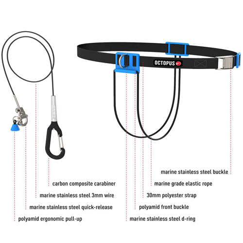 Das CNF Oktopus Lanyard wurde entwickelt, um ein Maximum an Sicherheit, Effizienz und Komfort für Freitaucher mit konstantem Gewicht ohne flossen (CNF) zu bieten.