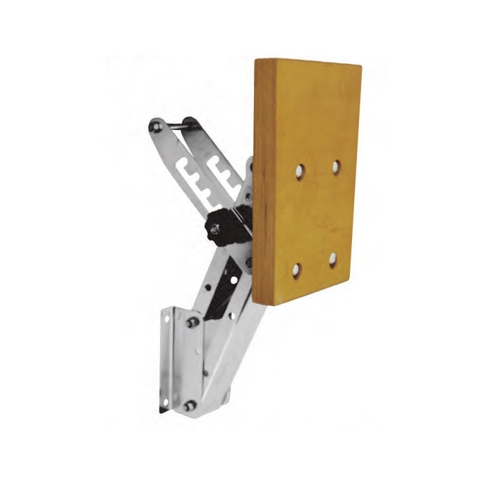 Der Körper dieses Motorträgers, ausklappbar und kippbar, besteht aus rostfreiem Stahl und sein hölzerner Träger