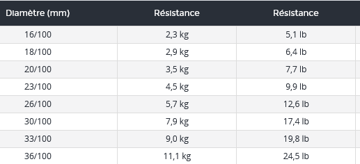 | Tournament SF Grün | 16/100 2,3 kg 18/100 2,9 kg 20/100 3,5 kg 23/100 4,5 kg 26/100 5,7 kg 30/100 7,9 kg 33/100 9,0 kg 36/100 11,1 kg |
