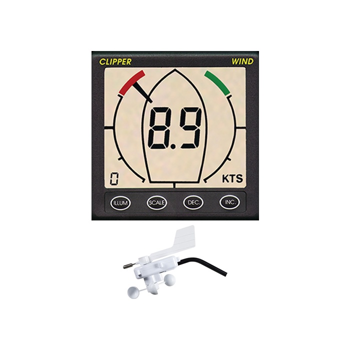 Cette girouette anémomètre donne les indications relatives au vent apparent : la direction du vent sur 360°, la vitesse (noeuds, miles ou mph) et la tendance de vitesse (accélération / décélération).