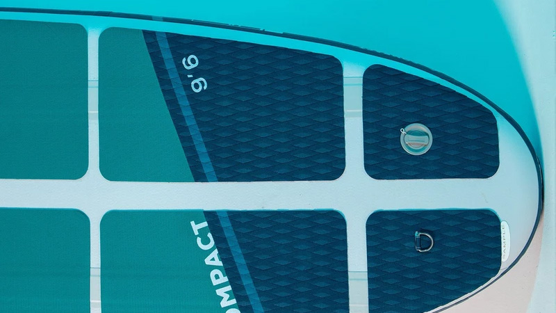 Die Compact-Serie hat jetzt einen neuen Look mit einem Mesh drop stitch in Hellgrau und Cyan und einem neuen geschlitzten Deck-Pad. Dadurch kann das Wasser leichter aus der board abfließen und sie lässt sich leichter verstauen. Die board kann entlang des Scharniers gefaltet werden, um das Zusammenfalten und Aufrollen zu erleichtern.
