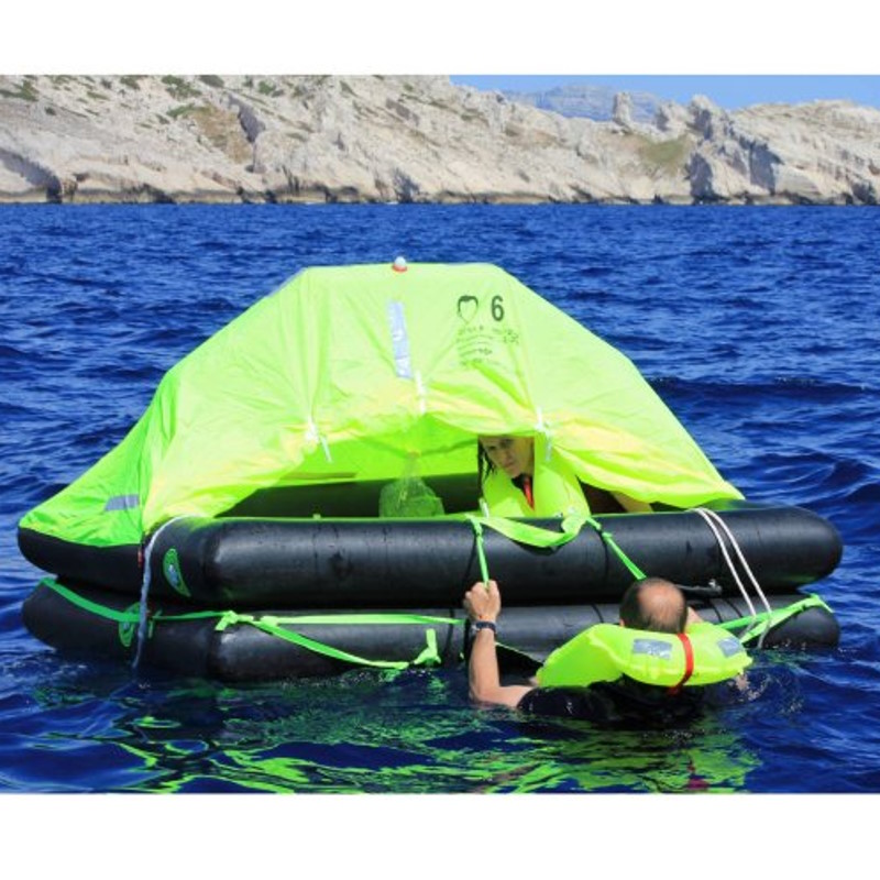 | Inhalt im Inneren des Floßes | 1 Wasserdichte tasche 1 Signalspiegel 1 Pfeife 3 Handfeuerwaffen 2 Fallschirmraketen 6 Tabletten gegen Seekrankheit pro Person 1 Brechbeutel pro Person 1 Taschenlampe 1 Batterie + Glühbirne 1 Reparaturset 1 ösfass 2 Schwämme 1 Pumpe 1 Schere 1 Handbuch 1 Schwimmendes Messer 1 Boje + schwimmleine 1 Treibanker 2 Paddel |