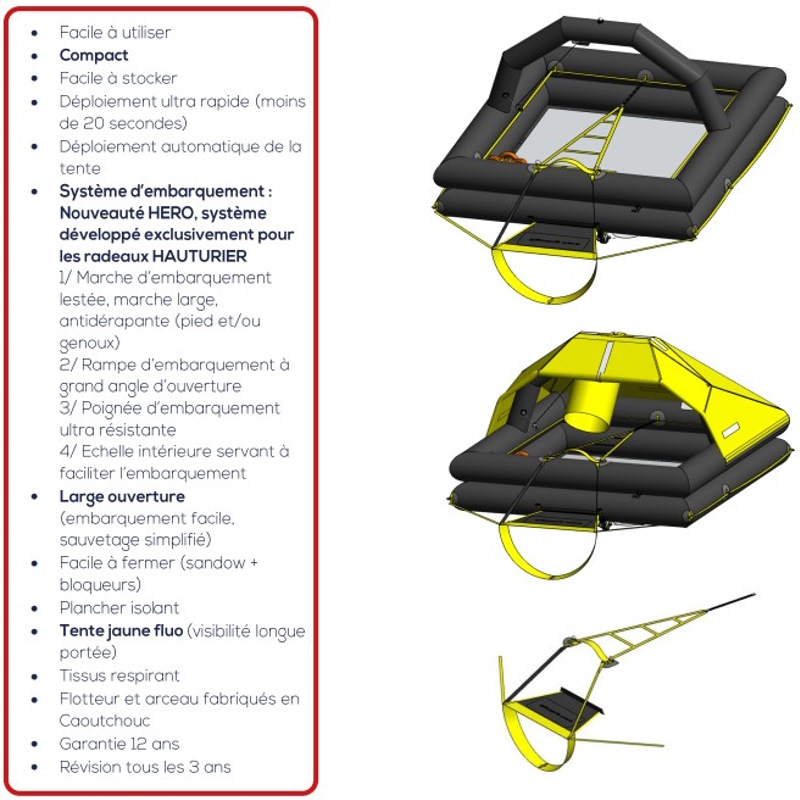 | Eigenschaften | •Automatische und ultraschnelle Bereitstellung • XXL-Verladeplattform • Starker Einstiegsgriff • Innere Leiter • Breite Öffnung und geräumiger Innenraum • Leicht zu schließen • Boden isolierung • Weitreichende Sichtbarkeit des neongelben Zeltes • Schwimmer und bögen aus Gummi • 4 Stabilisierungstaschen • Innen- und Außenbeleuchtung • Rettungsleinen innen und außen • Regenwassersammler • Wasserdichtes Zelt • Auslösung zwischen -15°C und + 65°C |