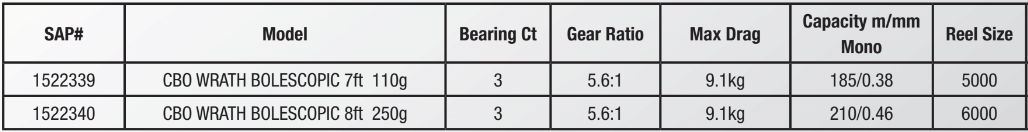 Die PENN Wrath Bolescopic Sets sind in zwei verschiedenen Versionen erhältlich; eine leichtere 7ft (213cm) Version, die mit Gewichten bis zu 110g verwendet werden kann und eine 8ft (244cm) Version bis zu 250g.