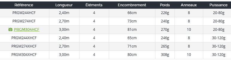 | 304XHCF | Länge in cm 300 Größe in cm 80 Leistung in g 30-120 Gewicht in g 308 |