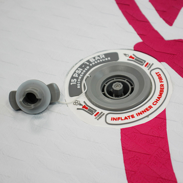 Ein Schema auf dem Ventil zeigt, wie der Druckknopf zu betätigen ist, um das board aufzublasen oder die Luft abzulassen. Es zeigt auch den empfohlenen maximalen Aufblasdruck an.