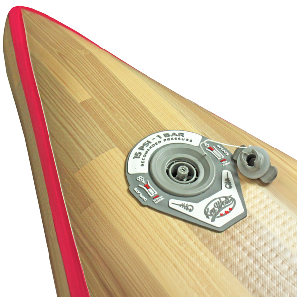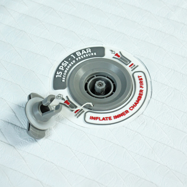 Ein Schema auf dem Ventil zeigt, wie der Druckknopf zu betätigen ist, um das board aufzublasen oder die Luft abzulassen. Es zeigt auch den empfohlenen maximalen Aufblasdruck an.