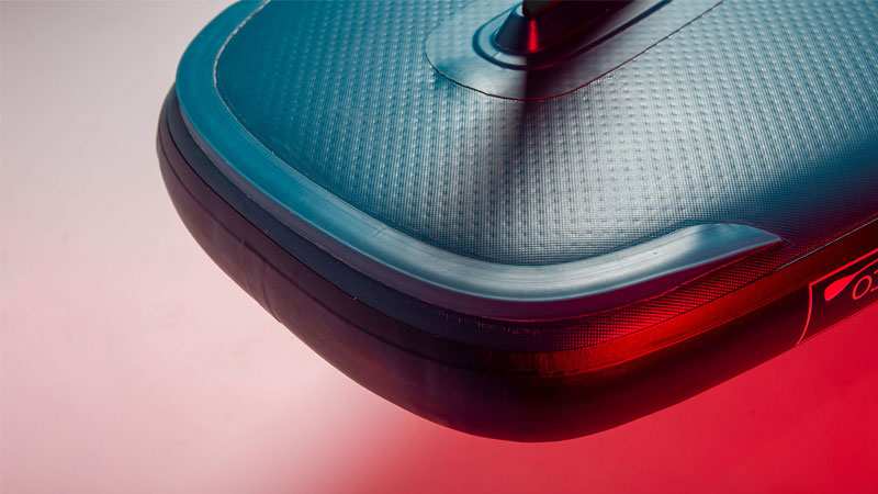 Die zweite PVC-Schicht wird mit der ersten Schicht heiß verschmolzen, wobei das Ganze straff gespannt wird. Zwischen den beiden Schichten wird eine unidirektionale Faser eingefügt, die auf der Konstruktion sichtbar ist. Diese Technologie senkt das Gewicht der sup um 2 kg im Vergleich zu allen anderen Wettbewerbern.